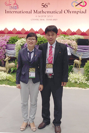 Việt Hà cùng thầy giáo. Cô gái duy nhất của đoàn học sinh việt Nam dự Olympic toán quốc tế 2015. Hà giành HCĐ